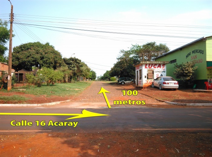 TERRENOS EN KM 16 ACARAY. MINGA GUAZÚ - El fraccionamiento está formado por 25 LOTES disponibles de diferentes medidas (Plano en las Fotografías) - Bajo tasación - Distancia de la Ruta Internacional 1650 M - Calle de empedrado frente al inmueble. - Por la ubicación del terreno, es excelente para la construcción e intalación de Galpones, Tinglados, Depósitos, distribuidoras E INDUSTRIA - También para la instalación de una Fábrica o Industria. - A dos cuadras queda la Avenida Principal de la Ciudad de Minga Guazú denominado como Calle 16, la cual ya está con capa asfáltica CERCA DEL PUENTE QUE UNE MINGA GUAZU CON HERNANDARIAS - Superficie cada Terreno: 360 m² aproximadamente cada lote (12X46 CADA LOTE.) Manzana 3B: 3.312 m2 (6 LOTES CALLE A CALLE) - Ciudad/ Distrito: Minga Guazú - Dirección: a Dos cuadras de la Avenida Km 16 mas conocido como Calle 16 - Ubicación Satelital (Google Maps): -25.510134, -54.662899 - venta a partir de 4 Lotes. precio bajo tasación